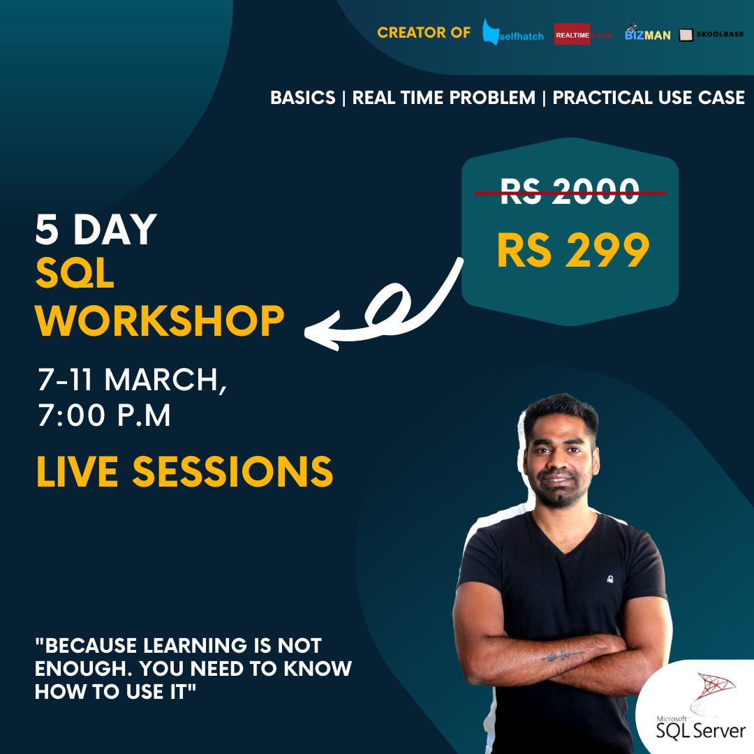 The SQL Live Workshop focuses on hands-on, practical learning with real-world situations and assessment. Upskill your workforce with our industry-leading SQL 5-Day Workshop. This workshop is designed to improve your SQL database management skills so that you can easily define, manipulate, control, and analyse data in the database and become an expert at solving complex queries. You'll learn from real-world examples that result in real-world outcomes. A total industry-related workshop will prepare you for your career, and you'll be able to ace the SQL interview and solve complex queries within a few minutes. Learn from an industry expert and boost your career. No prior knowledge is required for the workshop.